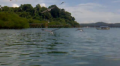 Destinasi pertama, adalah Pulau Dayang Bunting. Enjin bot dimatikan dan memang bentuk pulau seakan wanita mengandung yang sedang berbaring. Malangnya, gambar yang diambil sebanyak 2/3 kali hilang. Sesampai di jeti, Iman diserbu oleh seekor monyet yang cuba menarik begnya. Beg Danial yang berisi roti & tuna tidak diganggu pula.., rupanya kemudiannya baru kutahu yang Iman membawa sebotol air gas. (Dlm perjalanan balik lagi sekali beg cuba dirampas, kali ni Danial yang bawa beg Iman tu..air gas berjaya dibawa lari oleh monyet itu...ish ish ish..)
